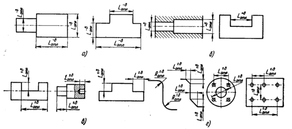 Классификация размеров отливок, изготавливаемых литьем под давлением основана на расположении отливок в форме. По этому признаку все размеры отливок можно разбить на три группы размеров, оформляемых: 1) в одной части формы, 2) в подвижной и неподвижной полуформах, 3) подвижными деталями формы. Кроме того по общим конструктивным признакам все названные размеры делятся на четыре группы: 1) охватываемые, 2) охватывющие, 3) открытые, 4) радиусы, фаски и расстояния между осями (рис.6.29)
