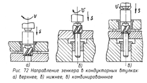 ля исправления положения оси отверстия, уменьшения увода ее и обеспечения заданной точности осуществляют зенкерование с направлением инструмента в кондукторных втулках. Различают три способа направления зенкера - верхнее, нижнее и двойное (Рис. 72).