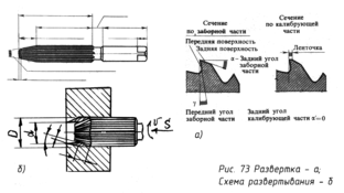 азвертывание. Развертывание является основным способом чистовой обработки отверстий диаметром до 400 мм H7-H8 квалитетов точности. Развертыванию всегда предшествует сверление, зенкерование или растачивание. Инструмент. При развертывании используют инструмент – развертку (Рис. 73). Развертка состоит из рабочей части, шейки и хвостовика (см. рис. 73, а)заменить рис. Хвостовик машинных разверток – конический, ручных разверток – цилиндрический с квадратом под вороток.сделать подписи на стрелках