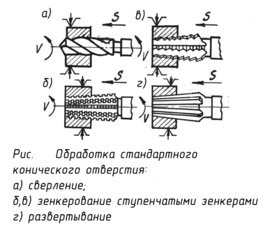 бработка отверстий комбинированным инструментом применяется в серийном и массовом производствах в целях повышения производительности и улучшения качества обработки деталей. Она осуществляется комбинированным инструментом, который позволяет совместить в один рабочий ход последовательно черновую и чистовую обработку одной поверхности, совместить различные операции: сверление и зенкерование, зенкерование и развертывание, развертывание и нарезание резьбы и т.д.