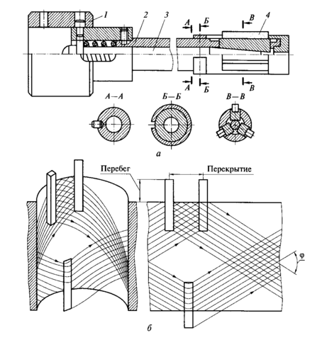 1 – хвостовик; 2 – корпус; 3 – разжимной шток; 4 – абразивный брусок; φ – угол скрещивания штрихов обработки