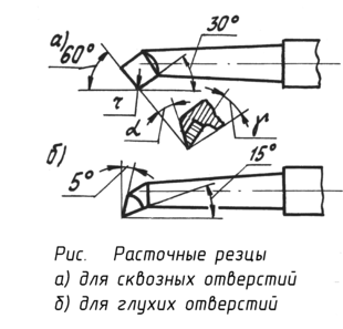 Сквозные и глухие отверстия глубиной более 100-150 мм растачивают державочными резцами. При растачивании сквозных отверстий стержень резца устанавливают перпендикулярно оси державки, а при обработке глухих отверстий - под углом 45° или 60°.
