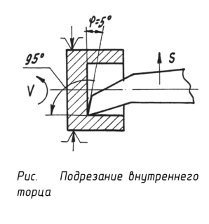 Схема растачивания сквозных отверстий диаметром до 100-150 мм показана на pиc. 78, а; схемы обработки ступенчатых и глухих отверстий - на рис. 78, б. При растачивании отверстий подрезаются и внутренние уступы. Эту операцию можно производить как с поперечной (рис. 78, в), так и с продольной (рис. 78, г) подачами. При подрезании с продольной подачей державку резца поворачивают на угол φ=5°