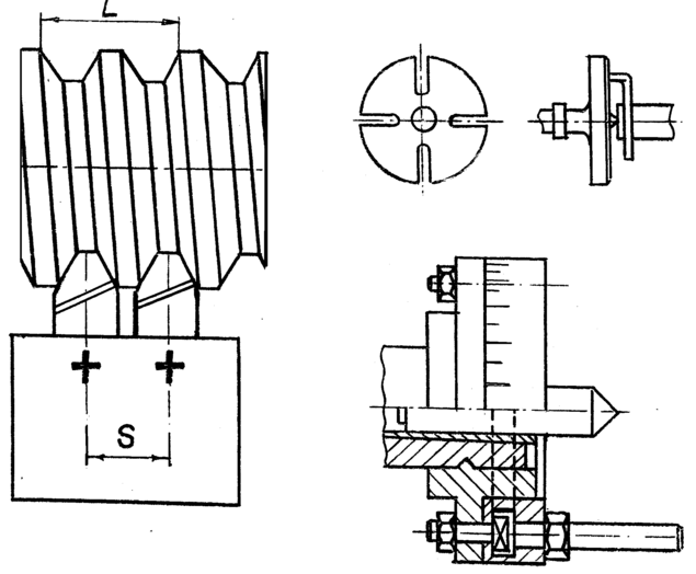 Например, если требуется нарезать 3-х заходную резьбу, то после каждого захода второй диск вместе с заготовкой поворачивают на угол, равный