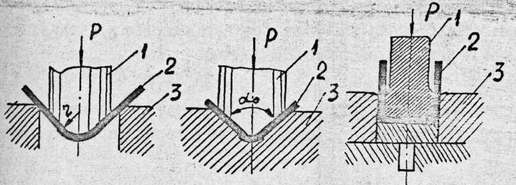 Рисунок 14. Различные схемы гибки: а – свободная гибка, б – гибка с прижимом, в – гибка с калибровкой.