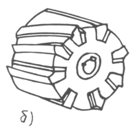 Типы фрез. В зависимости от назначения и вида обрабатываемых поверхностей различают следующие типы фрез: цилиндрические (рис.4а), торцевые (рис.4,б), дисковые (рис4,в), концевые (рис.4,г), угловые (рис4,д), шпоночные (рис. 4,е), фасонные (рис.4,ж).