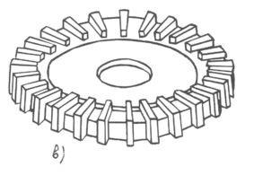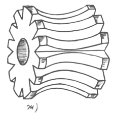 Фрезы изготовляют цельными (рис. 4,б) или сборными с напайными и вставными ножами (рис.4,в). Режущие лезвия могут быть прямыми" (рис.4,д) или винтовыми (рис.4,а). Фрезы имеют остроконечную (рис.4,з) или затылованную (рис.4,и) форму зуба. У фрез с остроконечными зубьями передняя и задняя поверхности плоские. У фрез с затылованными зубьями передняя поверхность плоская, а задняя выполнена по спирали Архимеда, при переточке по передней поверхности профиль зуба фрезы сохраняется.