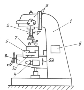 Рис.2. Общий вид вертикально-фрезерного станка: 1 – станина; 2 – шпиндель; 3 – шпиндельная головка; 4 – коробка подач; 5 – поперечный стол; 6 – коробка скоростей; 7 – продольный стол;
