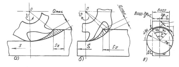 Рис.6 Схемы работы фрез: а – встречное фрезерование цилиндрической фрезой; б – попутное фрезерование цилиндрической фрезой; в – работа торцевой фрезы