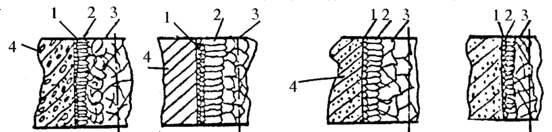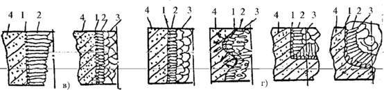 Рис.11 Влияние различных факторов на образование кристаллической структуры: 1- корка, 2- столбчатая зона, 3- крупная структура 4- форма.