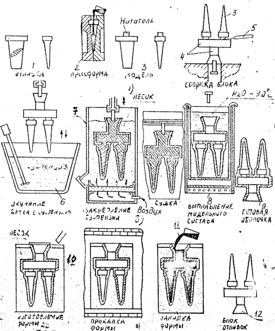 Процесс формирования оболочки состоит в следующем. На поверхность модельного блока окунанием в бак 6 наносят суспензию, которую немедленно закрепляют сухим зернистым огнеупорным материалом (размер зерна равен 0,25 мм). Обычно огнеупорный материал наносится при спускании блока в бак 7 с «кипящим» песком. Через слой песка продувают воздух, песчинки находятся во взвешенном состоянии, а поверхность песка похожа на кипящую воду. В «кипящий» песок тело входит так же легко, как в воду. Затем образовавшийся слой оболочки толщиной около 1 мм сушат при комнатной температуре в течение 3 часов. При сушке испаряется растворитель, слой оболочки твердеет вследствие необратимого процесса перехода коллоидного раствора двуокиси кремния из неустойчивого состояния – золя в устойчивое – гель. Гель цементирует зерна основы и сообщает слою оболочки прочность. Для получения оболочки необходимой толщины на блок наносят последовательно 4- 6 слоев и более. Таким образом, цикл нанесения оболочки длится 12-18 часов. Из оболочки моделей отливок и литниковой системы удаляют выплавлением паром или в горячей воде, помещая блок в бак 8 с водой. Получают прочную неразъемную с гладкой рабочей поверхностью оболочковую литейную форму 9. Оболочка 9 после выплавления из нее моделей пропитана водой и частично модельным составом. Для удаления всех веществ, которые могут быть источниками газов, оболочку прокаливают при температуре 900- 1000С. Для прокаливания оболочки засыпают сухим песком в ящиках 10 из жаростойкой стали (рис. 26 в). После прокаливания в печи формы заливают жидким сплавом 11. Отливки с литниковой системой называют блоками отливок 12.
