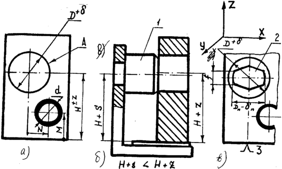 Срезанный палец имеет ленточки шириной f, образованные цилиндрической поверхностью диаметром Dn-n. Этими ленточками палец центрирует ось отверстия детали в направлении оси Х. Благодаря тому, что срезанный палец контактирует с отверстием только узкими ленточками, между пальцем и стенками отверстия в направлении размера Н образуется значительное расстояние, допускающее установку детали с погрешностями (z) во взаимном расположении баз. В зависимости от длины контакта пальца с отверстием он лишает деталь одной либо двух степеней свободы. Короткий палец (длина контакта <1.5Dn) лишает деталь одной степени свободы - ограничивает перемещение по оси Х; длинный - двух степеней свободы - ограничивает перемещение по оси Х и вращение относительно оси Z.