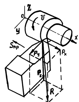 Абсолютная величина, точка приложения и направление в пространстве равнодействующей силы резания R в процессе обработки являются переменными.