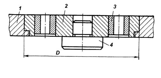 Групповой кондуктор со сменной частью (вставной) для сверления осевых отверстий в оправах может быть спроектирован на базе кондуктора (рис.2.2) с прижимной планкой. Конструкцией группового кондуктора предусмотрена возможность регулировки величины зажимного размера А, чем достигается возможность обработки оправ разной длины. Кондукторная плита (рис.2.3) состоит из постоянной части 1 и специальной вставки 2, в которой запрессованы кондукторные втулки 3 и установочный палец 4. Сменную вставку изготовляют для каждой оправы данной группы, если число, диаметры и расположение отверстий, а также диаметр установочного отверстия оправы отличаются от аналогичных параметров других деталей. Вставку устанавливают в плиту 1 по диаметру D и закрепляют (на рис.2.3 элементы крепления не показаны).