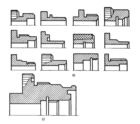 Сущность групповой обработки на токарно-револьверных станках заключается в следующем. Из деталей, подлежащих обработке на токарно-револьверных станках, комплектуют группы. В группе объединяют детали, имеющие незначительные отличия по конструктивно-технологическим признакам, к которым относятся габаритные размеры и геометрическая форма деталей, технологические свойства материала и вид заготовки, технологические приемы обработки. При этом не учитывают функциональное назначение деталей; в одну группу, например, могут попасть оправы и втулки, бленды и тубусы, диафрагмы и кольца и т. д. Из группы выбирают (или специально проектируют) так называемую “комплексную” деталь, в которой содержатся все разновидности поверхностей деталей, входящих в данную группу (рис.1.1).