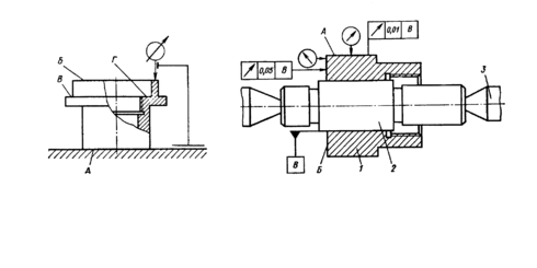На рис. 6.5. показана схема контроля параллельности торцов А и Б оправы, которая торцом А устанавливается на поверочную плиту, а торец Б «ощупывается» индикатором, закрепленным в стойке. Разность показаний индикатора при ощупывании торца Б должна быть меньше допуска на непараллельность. Аналогичным образом можно проверить параллельность торцов В и Г торцу А.