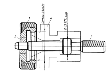 М240,5 кл. 2а относительно отверстия 14-0,006 оправы 4. Гайку 1 с втулкой 2 навинчивают на контролируемую резьбу оправы 4, пробку 3 вводят в контролируемое отверстие. Деталь считают годной, если пробка входит в отверстие втулки 2. Втулку и пробку притирают с зазором 2-3 мкм.