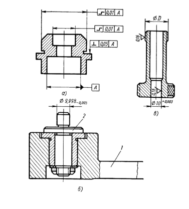 Точность расположения поверхностей оправ, подобных оправе, изображенной на рис. 6.7.,а, на заводах контролируют на приспособлениях (рис.6.7.,б), состоящих из плиты 1, в которой закреплен постоянный палец 2. Контроль проводят с помощью комплекта вкладышей (рис. 6.7.,в) и стойки с индикатором. Из комплекта подбирают вкладыш, который плотно с минимальным зазором входит по диаметру D в базовое отверстие А оправы. Вкладыш вместе с оправой по диаметру 10+0,003 надевают на палец. Стойку с индикатором устанавливают на плите так, чтобы измерительный стержень индикатора касался контролируемой поверхности. При вращении вкладыша измеряют соосность и торцевое биение.