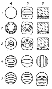 При наличии на детали выпуклой сферической и равномерном наложении РПС величина воздушного зазора в центре будет меньше, чем по краю (рис.1, 3В), образуются концентрические кольца, расходящиеся от центра при легком нажиме на РПС (рис.1, 3А). Такой цвет называется бугром. При неравномерном наложении РПС (полном или частичном) образуется воздушный клин и концентрические дуги с центром, расположенным в тонкой части воздушного клина (рис.1, 3Б, 5Б).