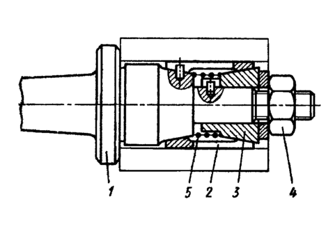 Для закрепления длинных оправ по внутренней поверхности применяют оправки с двусторонней цангой 2, ввиду того, что длинную цангу изготовить невозможно (рис.3.4). Цанга располагается между конусами корпуса 1 и подвижной втулки 3. Зажимной гайкой 4 втулка 3 перемещается в направлении конуса корпуса. Конические поверхности двусторонней цанги скользят по конусам корпуса 1 и втулки 3, что приводит к одновременному разжатию лепестков цанги с обеих ее сторон, а значит центрированию и закреплению детали. При отвертывании гайки 4 втулка 3 возвращается в исходное положение пружиной 5.