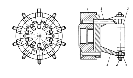 Мембранный патрон для закрепления деталей по наружной поверхности (рис. 3.2), представляет собой корпус 1, к которому крепится мембрана 6. В кулачки мембраны ввернуты и законтрены гайками 4 закаленные винты 5. После установки винтов их расшлифовывают под размер, несколько меньший наружного диаметра закрепляемой детали 3. При нажатии штока (на рис. 3.2 не показан) на мембрану она прогибается, кулачки расходятся, и деталь свободно входит между винтами до упоров 2, определяющих положение детали в осевом направлении. После прекращения действия штока мембрана возвращается в начальное положение; кулачки, сходясь к центру, центрируют и закрепляют деталь.