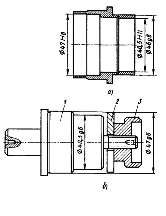 Для обработки наружного диаметра 46g6 оправы (рис.3.5(а)) используют оправку (рис.3.5(б)) с осевым зажимом. Деталь устанавливают на оправку 1 по диаметрам 47H8 и 40.5H11 и прижимают к торцу А с помощью быстросъемной шайбы 2 и гайки 3.