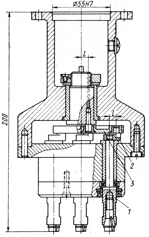 В приборостроении ввиду обработки отверстий малого диаметра в деталях из алюминиевых и медных сплавов конструкции многошпиндельных головок с кривошипным приводом имеют следующие отличия от вышеописанных (рисунок 10). Ввиду малых межцентровых расстояний обрабатываемых отверстий в опорах рабочих шпинделей 1 применяют подшипники скольжения. Сравнительно малые крутящие моменты при обработке отверстий определяют отсутствие противовеса на кривошипном диске и малый эксцентриситет положения поводков (в некоторых головках до 2 мм). Большое значение при проектировании головки имеет правильный выбор конструкции поводка рабочих шпинделей. При малых эксцентриситетах поводок 2 выполняют цельным. При эксцентриситетах свыше 5 мм поводок рабочего шпинделя выполняют составным. В отверстиях диска 3 устанавливают и расклепывают цилиндрические пальцы, а на конце каждого рабочего шпинделя закрепляют обойму, имеющую продольный паз для ведущего пальца. Такая конструкция поводка позволяет обрабатывать отверстия в кривошипном диске с гораздо меньшей точностью, так как при некотором смещении от оси шпинделя поводок, при вращении имеет возможность скользить в пазу обоймы шпинделя. Для увеличения плавности вращения рабочих шпинделей в некоторых конструкциях головок плоскопараллельное перемещение (вращение каждой точки кривошипного диска) осуществляется не одним, а двумя и даже четырьмя водилами.