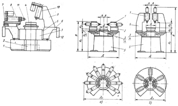 На рисунке 9, а изображена конструкция специальной зубчатой головки, предназначенной для сверления 12 отверстий диаметром до 3 мм, равномерно расположенных по окружности. Головка состоит из соединенных между собой корпуса 1 и крышки 2, внутри которых установлены центральное зубчатое колесо 3 и рабочие шпиндели 4. От шпинделя станка крутящий момент передается через центральное колесо рабочим шпинделям, ведомые зубчатые колеса которых расположены в два яруса. Сравнительно малый крутящий момент и осевые силы, передаваемые при сверлении, а также малые габаритные размеры головки обусловили некоторые особенности ее конструкции, а именно: рабочие шпиндели и устанавливаемые на них зубчатые колеса изготовляют цельными; с целью плавной и бесшумной работы зубчатой пары ее центральное колесо изготовляют из текстолита или капрона, а при несколько больших крутящих моментах — из бронзы. С этой же целью зубчатые колеса изготовляют винтовыми с углом наклона 15—20°. Осевая сила рабочих шпинделей при сверлении воспринимается непосредственно радиальным подшипником, упорные подшипники в головках подобного типа не устанавливают.