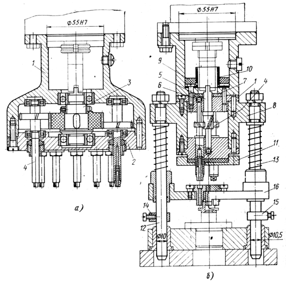 Обрабатываемую деталь устанавливают в приспособлении на столе настольно-сверлильного станка. При подъеме стола вверх производится прижим обрабатываемой детали, а затем сверление отверстий. Ориентация шпинделей головки относительно обрабатываемой детали производится с помощью направляющих колонок 12 и 13. С целью избежания ошибки ориентации на 180° колонки выполняют различных диаметров. Упоры 14 и 15 ограничивают перемещение кондукторной плиты 16 при опускании стола.