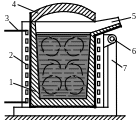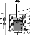 1 – тигель; 2 – водоохлаждаемый индуктор; 3 – электрическая шина генератора; 4 – съёмный свод; 5 – выпускной жёлоб; 6 – поворотная ось; 7 – стойка