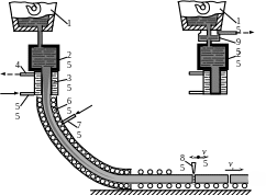 1 – ковш; 2 – промежуточное разливочное устройство; 3 – кристаллизатор; 4 – сливная труба; 5 – водонапорная труба; 6 – тянущий валок; 7 – водная форсунка; 8 – газовый резак; 9 – вакуумная камера