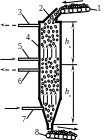 1 – загрузочный конвейер; 2 – приёмное устройство; 3 – откачивающая газовая труба; 4 – шахтная печь; 5 – подающая газовая труба; 6 – откачивающая воздушная труба; 7 – подающая воздушная труба; 8 – выгружающий конвейер; hв – зона восстановления; hо – зона охлаждения