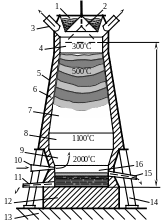 1 – засыпной аппарат; 2 – запорный конус; 3 – газоотвод; 4 – колошник; 5 – стальной кожух; 6 – огнеупорная кладка; 7 – шахта; 8 – распар; 9 – заплечики; 10 – фурма; 11 – лётка для чугуна; 12 – лещадь; 13 – фундамент; 14 – опорная колонна; 15 – лётка для шлака; 16 – горн