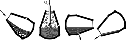 а – загрузка стального лома и последующая заливка чугуна; б – введение фурмы и подача кислорода; в – выпуск стали; г – слив шлака