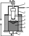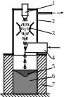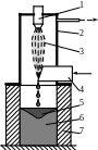 1 – водоохлаждаемый шток; 2 – вакуумная камера; 3 – переплавляемый электрод; 4 – металлическая ванна; 5 – образующийся слиток; 6 – водоохлаждаемая изложница; 7 – затравка