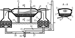 1 – передняя стена; 2 – задняя стена; 3 – свод; 4 – под; 5 – загрузочное окно; 6 – выпускной жёлоб; 7 – дымовая труба; 8 – топливная труба; 9 – головка печи; 10 – кислородная труба; 11 – насадка; 12 – регенератор; 13 – железобетонная опора; 14 – дымоход; 15 – перекидной клапан; 16 – воздуховод; 17 – правый газоход; 18 – левый газоход; 19 – пол мартеновского цеха