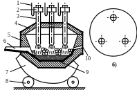 Рис. 7. Разливка сверху (а) и сифонная разливка (б) стали в изложницы: