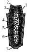 1 – прибыль; 2 – усадочная раковина; 3 – усадочная рыхлость; 4 – мелкозернистый слой (корка); 5 – зона столбчатых зёрен; 6 – зона крупных равноосных зёрен; 7 – донная часть