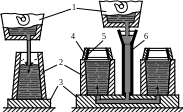 1 – ковш; 2 – изложница; 3 – поддон; 4 – надставка;