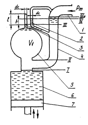 Исходное положение уровня ртути соответствует метке I, при этом колба 5 оказывается наполненной газом, давление которого (Pm) мы должны измерить. Затем мы плавно поднимаем уровень ртути. Объем V1 колбы 5 оказывается отрезанным от измерительной системы, когда уровень ртути достигает отметки II. Продолжая поднимать уровень устанавливаем его на отметке III (в “измерительном” капилляре), при этом степень сжатия газа n: