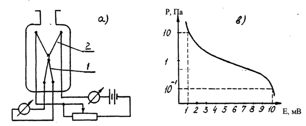Типичный манометрический датчик такого типа – датчик ЛМ-2, служащий для измерения давлений в диапазоне 10-1…10-5 Па, схема которого приведена на рис. 45а