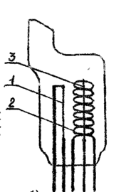 На Рис.45б показана схема датчика ИМ-12, выполненного по указанному принципу. Вольфрамовый катод 1 вынесен за пределы сетки 2, выполненной в виде спирали из молебдена. Коллектор ионов 3 расположен в центре и выполнен в виде слегка конической иглы из вольфрамовой проволоки толщиной 150 мкм. Постоянная датчиков ИМ-12 (стеклянного) и МИ-12 (металлического) ка=(1…4) 10-4 А Па-1 при токе эмиссии 5 мА. Фоновый ток в датчиках ИМ-12 (МИ-12) составляет 3 10-12 А (вместо 5 10-9 А для ЛМ-2), диапазон измеряемых давлений от 10-3 до 10-8 Па.