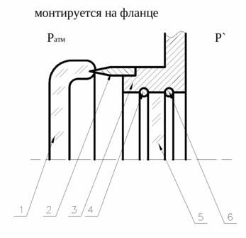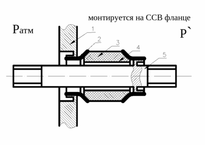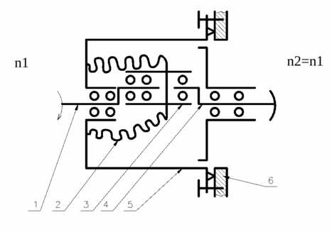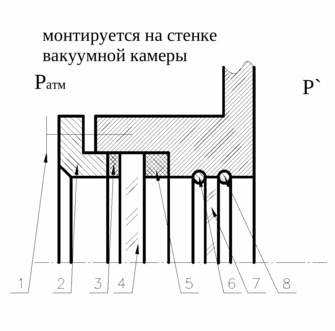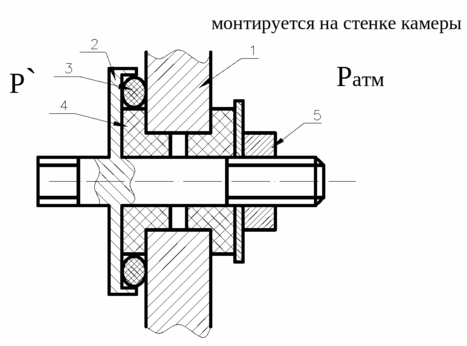 Обозначения: 1 – входной вал; 2 – сильфон; 3 – глухая втулка (колебательный промежуточный элемент; 4 – выходной вал; 5 – корпус ввода (Dу16-100); 6 – стенка вакуумной камеры.