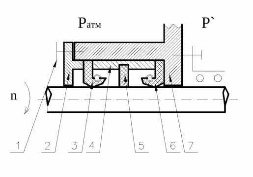 Обозначения: 1 – натяжной болт; 2 – нажимной фланец; 3 – вспомогательная манжета; 4 – нажимная втулка; 5 – сальник (фетр) с маслом д/упл.; 6 – рабочая манжета; 7 - корпус