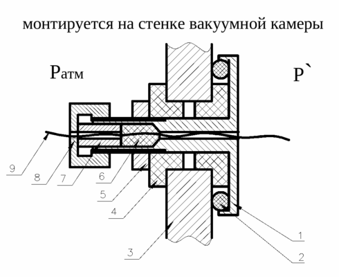 Обозначения: 1 – корпус ввода (с отверстием); 2 – уплотнение (прокладка кольцевая); 3 – стенка вакуумной камеры сталь 1Х18Н10Т; 4 – изоляторы; 5 – гайка уплотнительная; 6 – пробка уплотнитель; 7 – поршень; 8 – нажимная гайка; 9 – нить термопары.