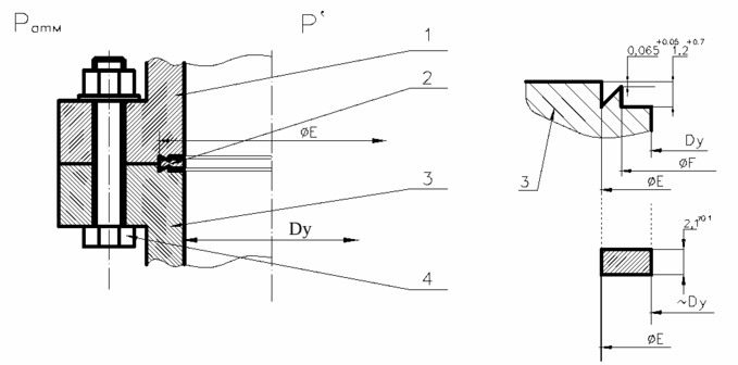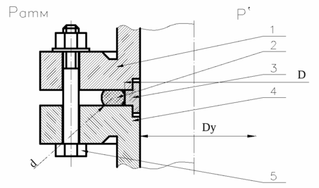 Обозначения: 1 – верхний фланец (сталь 1Х18Н10Т); 2 – уплотнение из резины (круглый профиль диаметром dмм, имеет деформацию около 12%); 3 – ограничитель деформации (алюминиевое кольцо); 4 – нижний фланец (сталь 1Х18Н10Т); 4 – болт