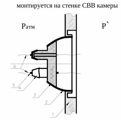 Обозначения: 1 – стекло, впаянное на ковар; 2 – ковар (для согласования перехода); 3 – стенка (фланец Dу40-100); 4 – стопорное кольцо; 5 – защитное стекло; 6 – стопорное кольцо.