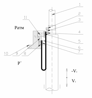 Обозначения: 1 – шток; 2,11 – гайка натяжная для уплотнения кольца; 3,9 – втулка нажимная; 4,8 – уплотнительное кольцо; 5 – кольцо наружное охватывающее чулок; 6 – чулок (уплотнительный элемент движущегося вала); 7 – стенка вакуумной камеры (фланец)