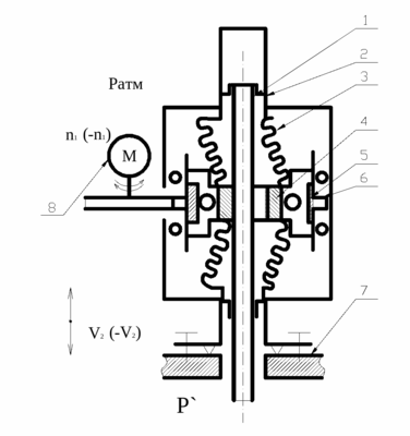 Обозначения: 1 – шток; 2 – корпус; 3 – сильфон; 4 – колеблющаяся гайка, совершающая круговые плоские параллельные движения; 5 – эксцентрик; 6 – шестерня приводная; 7 – стенка вакуумной камеры; 8 – электродвигатель