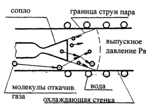 Принцип работы диффузионного насоса заключается в откачке молекул газа струей пара, переносящей откачиваемые молекулы из области впуска к выпускному патрубку. На рис. 27 показан принцип работы насоса с “прямым” диффузионным соплом. Главной частью такого насоса является расположенное в центре охлаждаемого водой или воздухом корпуса прямоточное расширяющееся сопло (сопло Ловаля).Струя паров масла или ртути выходящая из сопла со сверхзвуковой скоростью образует расходящийся конус и касаясь холодного корпуса, конденсируется на нем.
